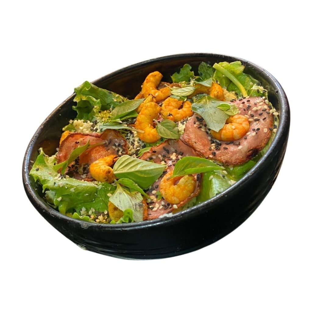 Alface americana, alface roxa, parmesão, milho, bacon, tomate, mix de gergelim e strag.