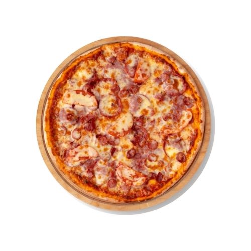 Molho de tomate especial, mussarela , lombo canadense, champignon, requeijão (tipo Catupiry) e orégano.